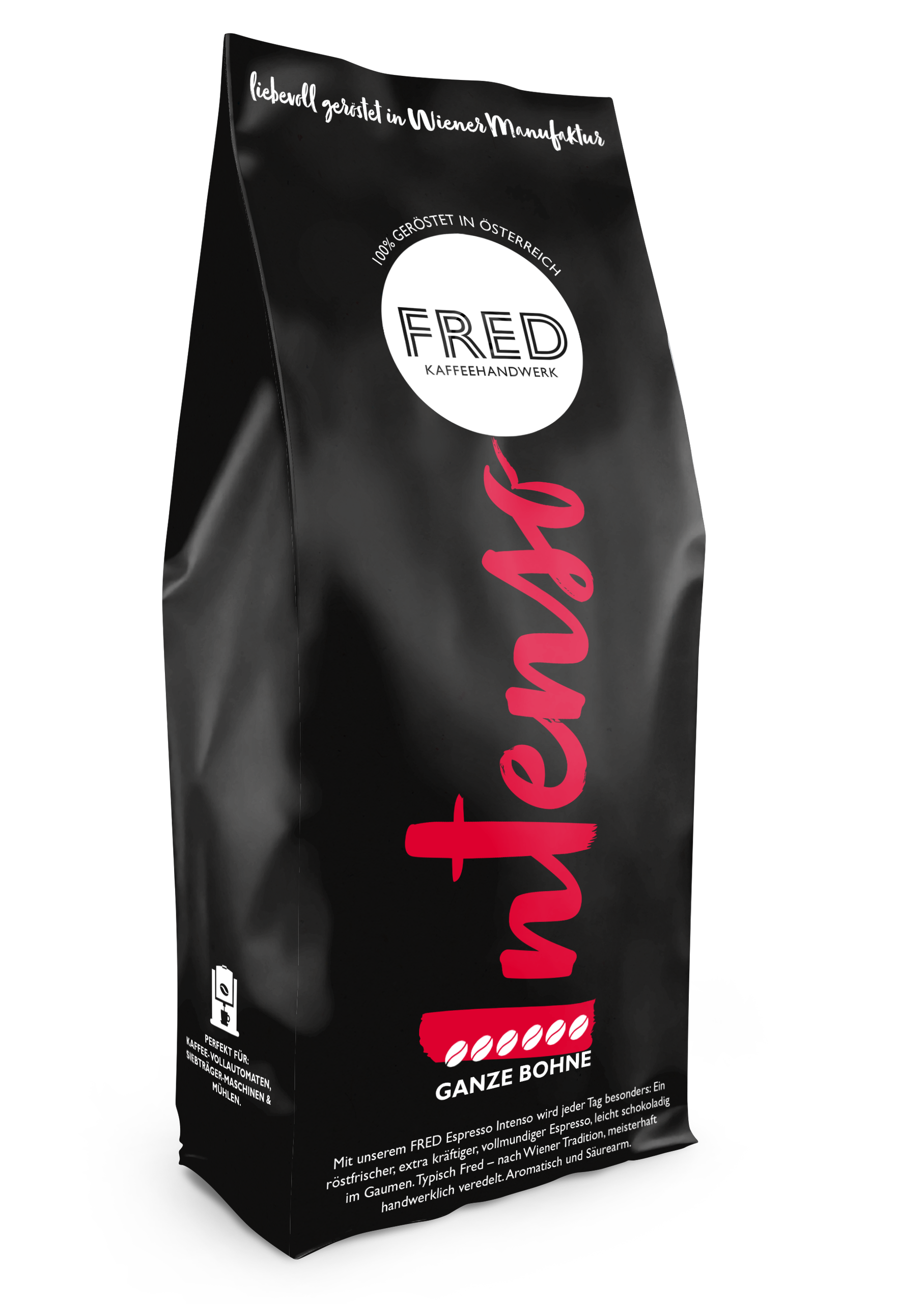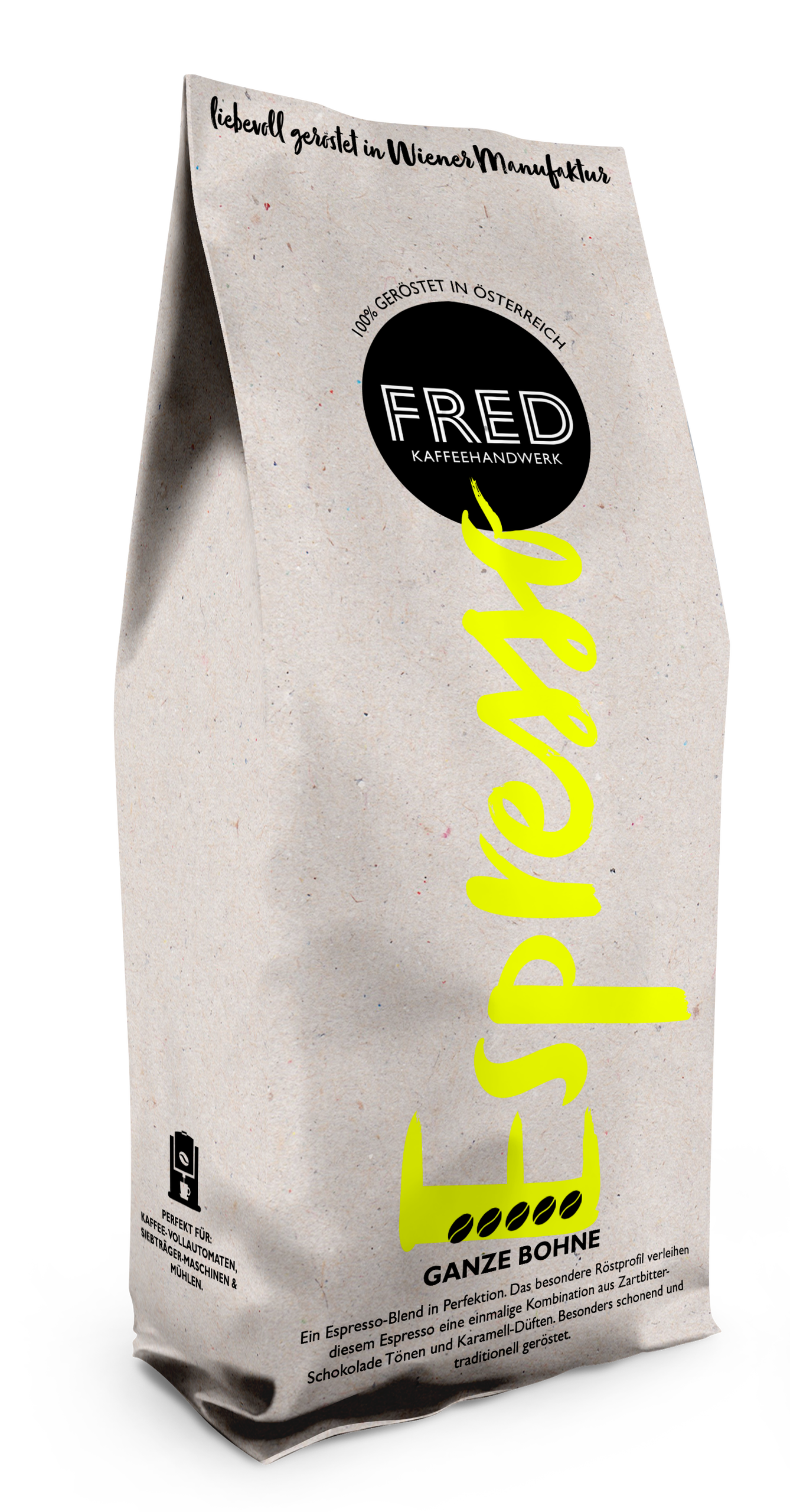 Vollmundiger Espresso, leicht schokoladig im Gaumen. Typisch FRED – nach